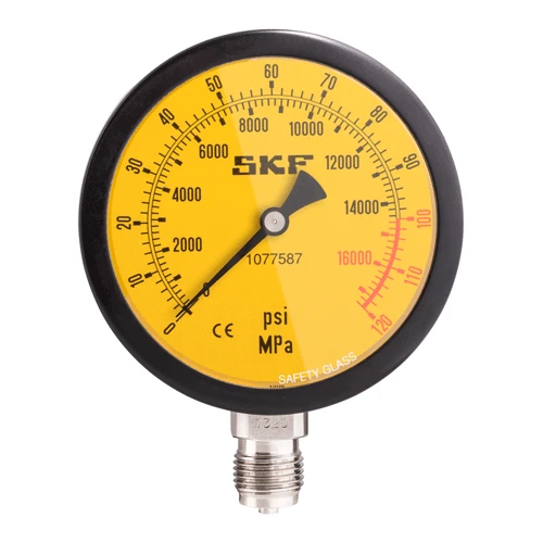 SKF Pressure Gauges are designed to fit SKF Hydraulic Pumps and SKF Oil Injectors. The gauges are all liquid filled and equipped with a restriction screw in order to absorb any sudden pressure drop thereby preventing damage. Safety glass and blowout discs are standard for all gauges and all have dual scales (MPa/psi).