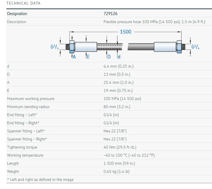 | Basic Product Description | Flexible high pressure hose 100 MPa, 1.5m long |