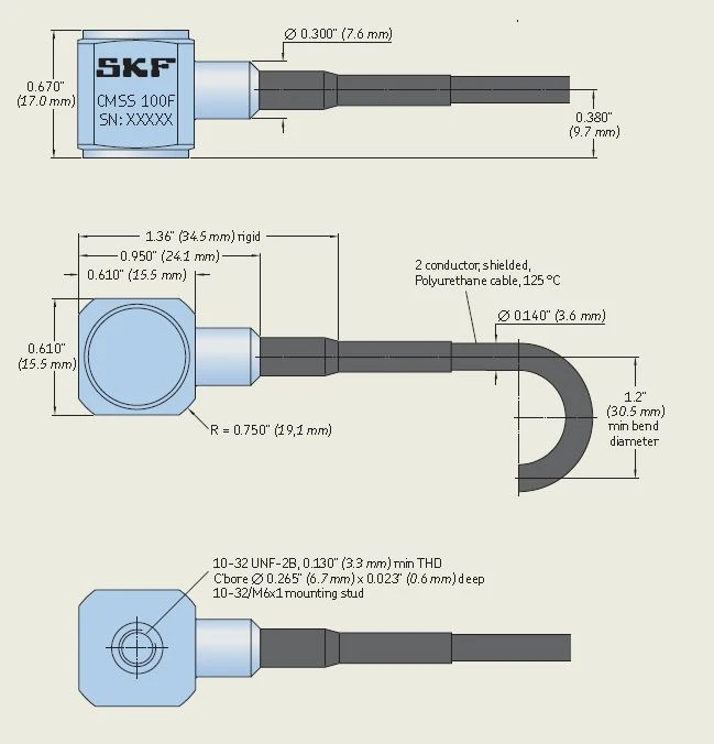 The CMSS 100F is a compact sensor with integral cable for use with SKF on-line surveillance systems. The sensor is commonly used to monitor spindles and bearings.