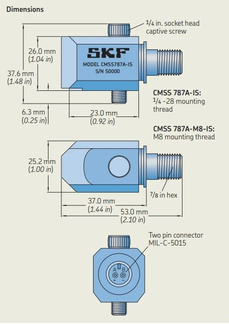 Common applications include general purpose machines such as pumps, motors, fans and gearboxes. The CMSS 787A-IS is particularly suitable for the SKF on-line surveillance and protection systems since, in this case, no additional barriers are required for use in hazardous areas.
